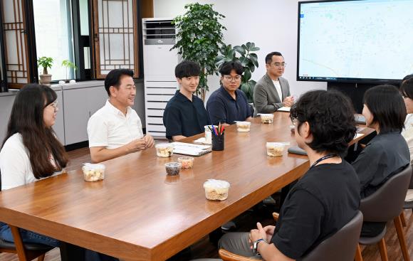 ▲ 김동근 시장이 8월 26일 시장실에서 본청 소속 9급 직원 7명과 함께 ‘카페 무지개’를 열고 대화를 나누고 있다. |