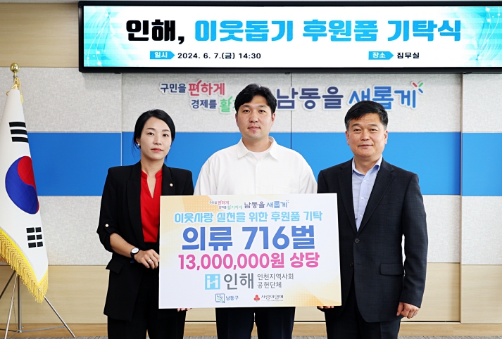 [뉴스서치] 인천시 남동구는 지역사회 공헌 봉사단체 ‘인해’로부터 취약계층을 위한 후원품 의류 716벌(1,300만 원 상당)을 기탁받았다고 11일 밝혔다.