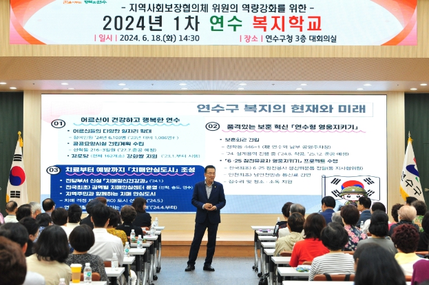 [뉴스서치] 연수구 지역사회보장협의체는 지난 18일 구청 대회의실에서 위원 100여 명을 대상으로 “2024년 연수복지학교 1차, 주민에게 도움이 되는 복지상식”이라는 주제로 역량강화 교육을 진행했다.