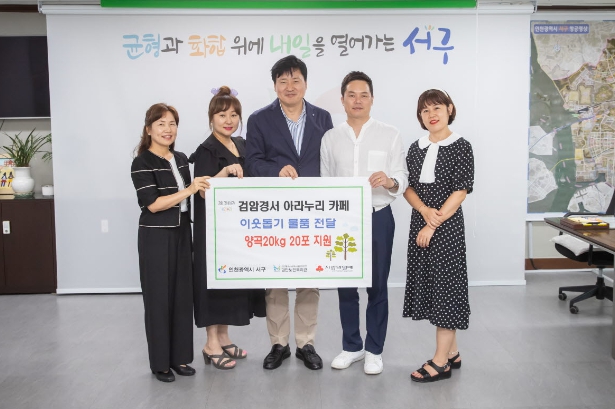 [뉴스서치] 인천 서구는 지난 19일, 검암경서 아라누리카페(매니저 이미영)로부터 이웃돕기 물품 양곡20kg 20포를 전달받았다.
