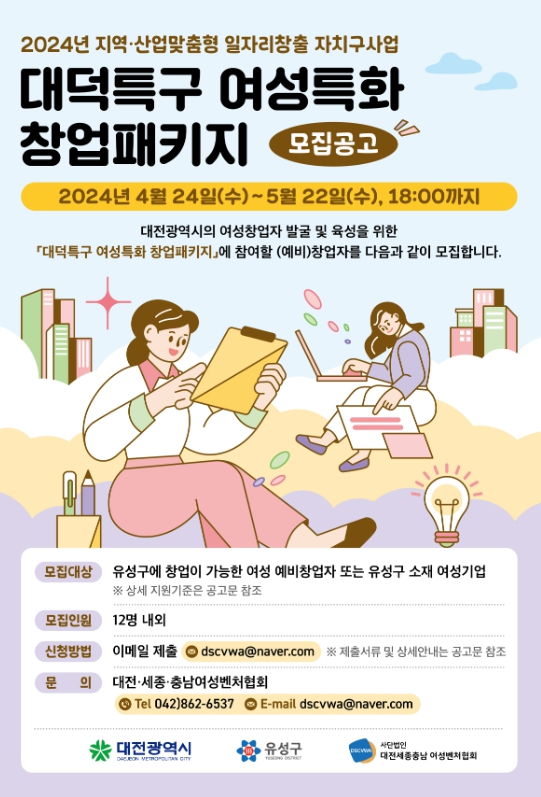 [뉴스서치] 대전 유성구가 24일부터 5월 22일까지‘대덕특구 여성 특화 창업패키지’사업 참여자를 모집한다.