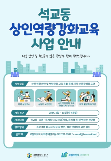 교육 내용은 특허, 세무 등의 법률지원과 브랜드마케팅, 경영전략, 배달 앱 사용법 등 실제 사업에 필요한 교육 위주로 구성하고 또한, 지역 상권 활성화를 위해 석교동 주민과 연계한 현실적인 협업방안을 마련하고자 워크숍 프로그램도 진행될 예정이다.