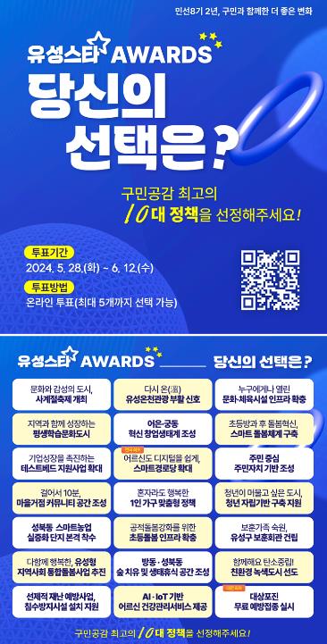 [뉴스서치] 유성구가 민선8기 선보인 다양한 정책 중 유성을 빛낸 '구민공감 10대 정책'을 선정하기 위해 28일부터 6월 12일까지 온라인 투표를 진행한다.