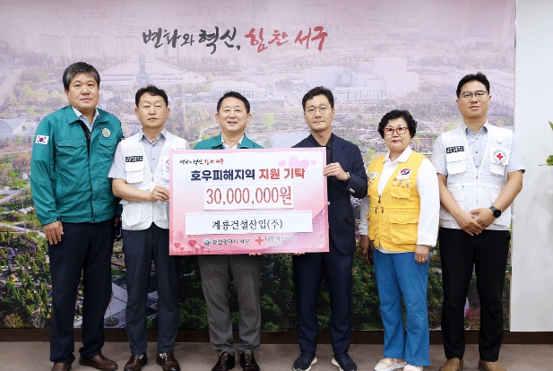 서철모 청장은 “우리 지역을 위해 소중한 기탁을 해주심에 감사드리며, 서구도 피해 지역 곳곳의 복구에 최선을 다하겠다”라며 “계룡건설산업(주)도 더욱 크게 발전하고 번창하여 지역사회와 함께하는 일류기업이 되어 달라”고 말했다.