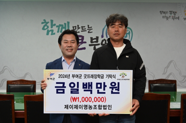 [뉴스서치] 제이제이영농조합법인(대표 이철희)은 지난 1일 부여군청을 방문하여 인재 육성을 위한 장학금 100만 원을 부여군굿뜨래장학회(이사장 박정현)에 기탁했다.