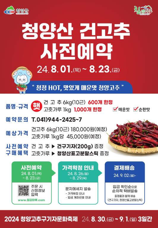 [뉴스서치] 청양군은 오는 8월 1일부터 23일까지 ‘2024년 청양고추구기자 문화축제 건고추(고춧가루) 사전예약 접수’를 실시한다.