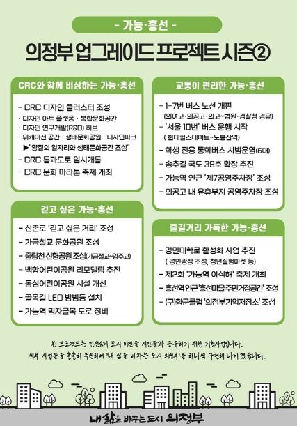 한편, ‘의정부 업그레이드 프로젝트’는 내 삶을 바꾸는 도시 의정부의 비전을 주민들과 공유하기 위한 기획사업이다. 시는 추진 중인 교통, 상권, 문화, 교육, 복지 등 분야별 사업들을 동별로 체계화해 해당 동 주민들이 더 쉽게 체감할 수 있도록 제공하고 있다. 이달 말에는 의정부 업그레이드 프로젝트 ‘금오‧자일편’이 발표된다.