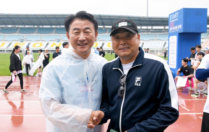 ▲ CRC 문화 마라톤 행사에 참여한 김동근 시장과 이봉주 선수 |