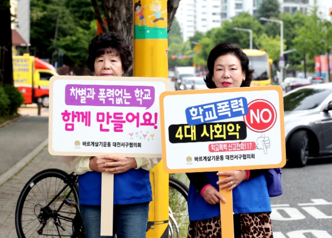 [뉴스서치] 대전 서구 바르게살기운동 대전서구협의회는 지난 17일 탄방중학교 앞에서 학부모 학생 등 40여 명이 참석한 가운데 비폭력 학교문화 조성을 위한 학교폭력 예방 캠페인을 전개했다.