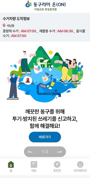 한편 지난 3월 산수동에 개관한 친환경자원순환센터와 함께 구축한 자원순환 통합플랫폼 ‘동구라미 온(ON)’은 주민의 자원순환 생활을 돕기 위해 청소차 도착 정보, 스마트 수거함 지도, 쓰레기 해결단 등 다양한 기능과 정보를 통합 제공하고 있다.