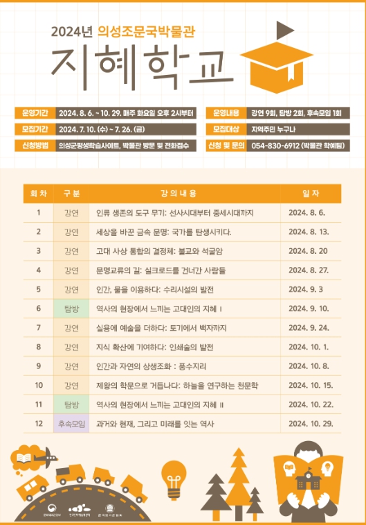 의성조문국박물관 지혜학교는 2024년 8월 6일부터 10월 29일까지 매주 화요일 오후 2시부터 의성조문국박물관 2층 세미나실에서 진행되며 역사, 문화, 예술을 아우르는 고품격 한국사 강연 9회, 현장탐방 2회, 후속모임 1회 등 총 12회 프로그램으로 구성되어 있다.