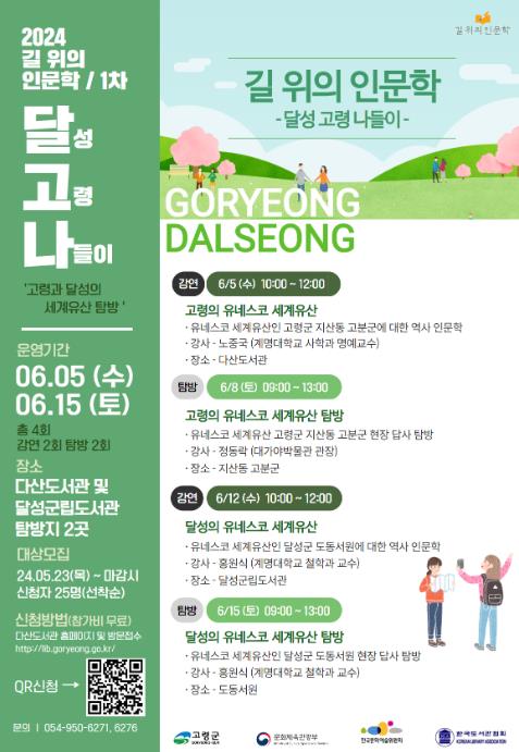 6월 5일부터 매주 수‧토요일 2주동안 총 4회에 걸쳐 세계유산이라는 고령과 달성의 역사자원을 바탕으로 인문학 강좌를 하고 그에 관련된 지역을 탐방하는 프로그램으로 구성된다.