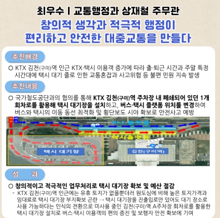 최우수에 선정된 교통행정과 상재철 주무관(공업7)은 KTX 김천(구미)역 주차장 내 폐쇄되어 있던 1개 회차로를 활용해 택시 대기장을 설치하고, 버스·택시 승강장 위치 변경으로 버스와 택시의 이동 동선 최적화, 횡단보도 시야 확보 등으로 예산 절감, 교통혼잡 해소, 안전사고 예방에 힘썼다는 평가를 받았다.