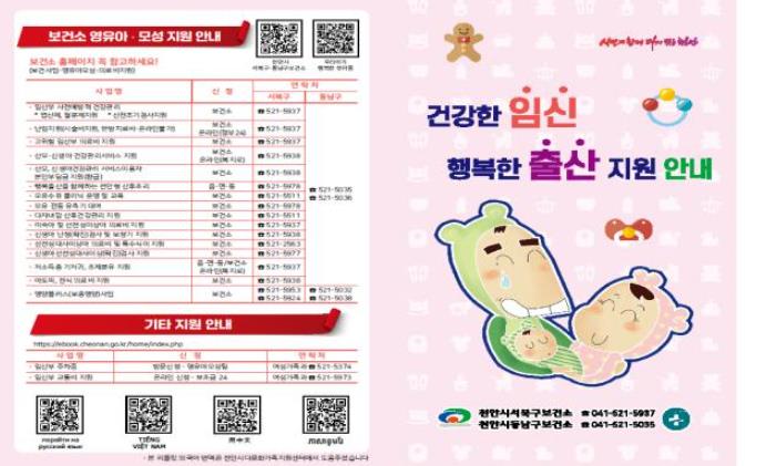 올해 처음 제작 시도한 다국어 안내서는 천안시다문화가족지원센터 직원들의 적극 지원으로 가능했으며현재 가임 인구가 많은 러시아, 베트남, 캄보디아, 중국어로 읽을 수 있도록 QR 코드로 전환되게 제작했다.