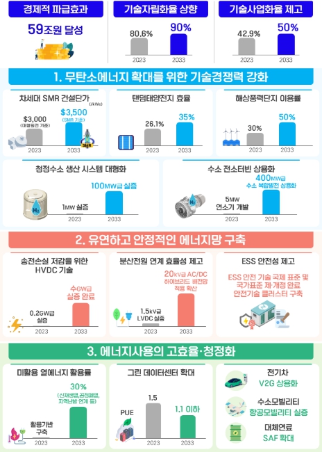 차세대 원자력, 재생에너지, 청정수소 등 주요 무탄소에너지의 핵심기술 확보를 추진한다. 소형 모듈형 원자로(SMR), 차세대 탠덤전지 등의 기술개발을 지원하여,원전의 활용도 증가와 재생에너지의 체계적인 확대 등을 추진한다. 이를 통해 국내 에너지신산업의 수출동력화를 도모한다.