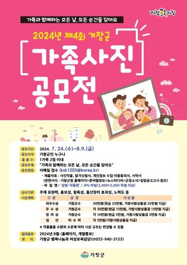 구인모 거창군수는 “가족의 의미와 소중함을 되새기고자 시작된 가족사진 공모전이 올해로 네 번째를 맞았다”라며 “많은 가족들이 이번 공모전으로 행복한 기억을 공유하는 시간이 될 것이라 생각한다. 군민 여러분의 많은 관심과 참여를 부탁한다”라고 말했다.