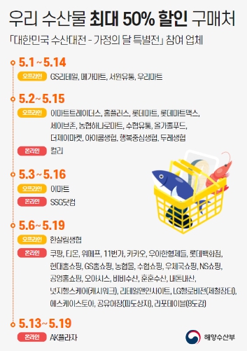이와 더불어, 해양수산부는 5월 할인지원에 156억 원의 예산을 투입한다. 5월 2일부터 19일까지 전국 45개 마트·온라인몰에서 「대한민국 수산대전-가정의 달 특별전」을 개최하고 있으며, 5월 3일부터 14일까지는 전국 63개 전통시장에서 「5월 온누리상품권 환급행사」도 진행하고 있다. 또한, 매주 목요일에는 제로페이 수산물 전용 모바일상품권도 20% 선 할인하여 발급하고 있다.