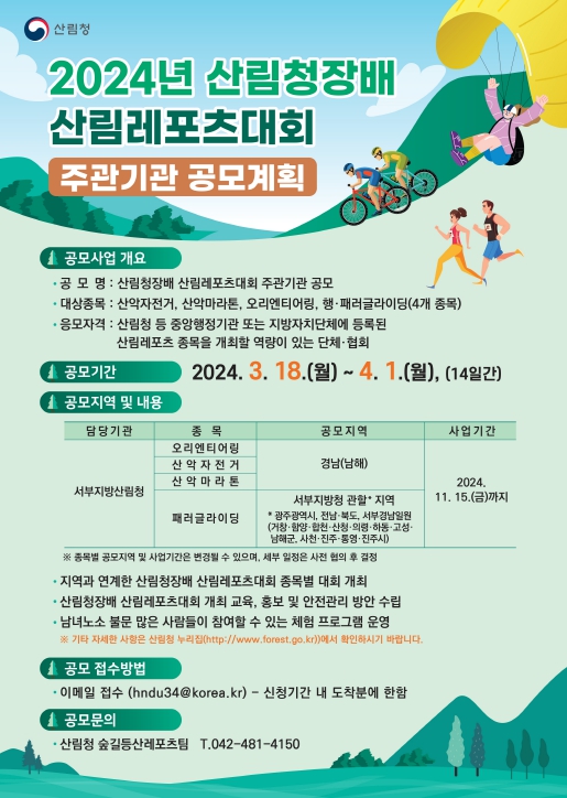 [뉴스서치] 산림청은 산림레포츠의 저변 확대 및 활성화를 위해 2024년 산림청장배 산림레포츠대회 주관기관을 오는 4월 1일까지 공모한다고 20일 밝혔다.