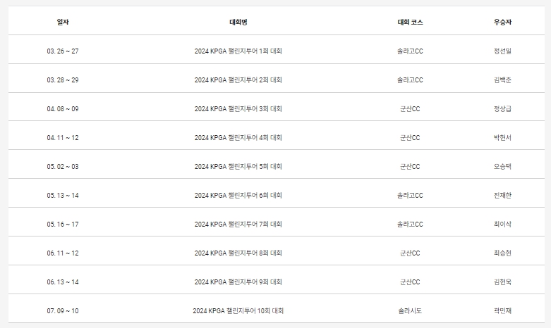 [뉴스서치] 2024 시즌 KPGA 투어 챌린지투어가 ‘10회 대회’를 기점으로 반환점을 돌았다. 올 시즌 KPGA 챌린지투어는 총 20개 대회가 진행된다.