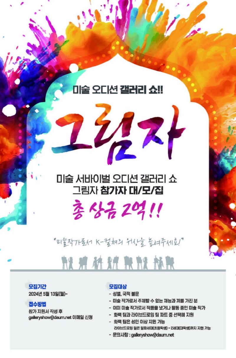 [뉴스서치] 미술 오디션 프로그램 '갤러리 쇼 그림자'가 오는 6월 15일 대구광역시에서 첫 예선을 시작으로 대장정을 시작한다. 총상금 2억 원이 걸린 이번 프로그램은 K-컬처 저변 확대를 목표로 기획됐으며, 각 지역에 숨겨진 미술 인재를 발굴하는 데 중점을 두고 있다.