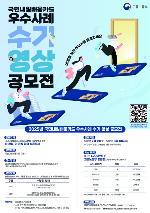 [뉴스서치] 고용노동부는 7월 7일부터 8월 10일까지 '2025년 국민내일배움카드 우수사례 수기·영상 공모전'을 개최한다. 참여를 희망하는 국민은 공모전 홈페이지에서 응모할 수 있다.