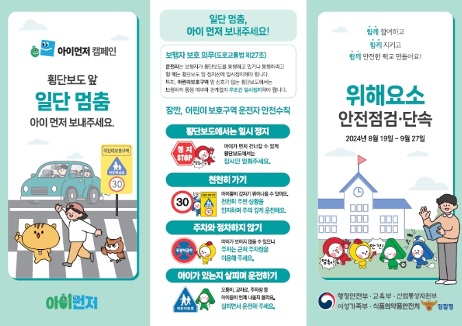 분야별 주요 점검 및 단속 내용은 (교통안전) 안전한 등하굣길 조성을 위해 학교 주변 공사장과 어린이 보호구역을 중점 점검한다. 공사장 주변 불법 적치물을 단속하고, 어린이 보호구역 내 교통법규 위반 단속과 어린이 통학버스 내 안전띠 착용 및 보호자 동승 의무 등 안전 수칙을 점검·안내한다. 특히, 아이들의 안전한 보행길을 위한 ‘일단멈춤, 아이 먼저 보내주세요’ 캠페인 홍보도 병행할 계획이다.
