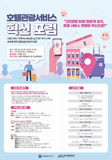 [뉴스서치] 문화체육관광부는 한국호텔업협회와 함께 5월 28일 오후 2시 30분, 서울 대한상공회의소 의원회의실에서 ‘호텔 관광서비스 혁신 포럼’을 열어 호텔을 둘러싼 환경변화를 진단하고 호텔 서비스 경쟁력 향상을 위한 방안을 논의한다.
