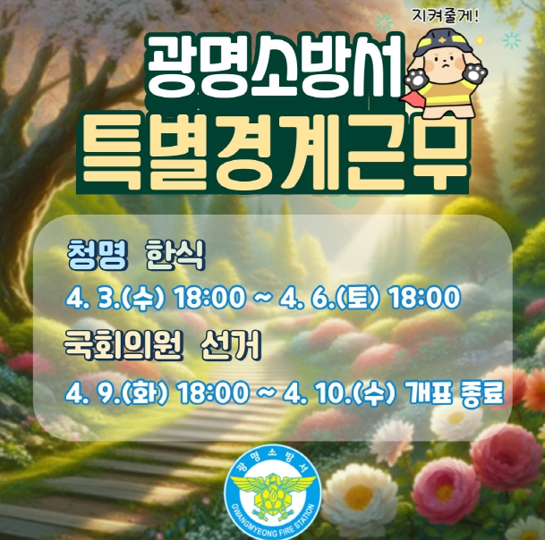 청명·한식 기간은 건조한 날씨가 지속되고 입산객 증가로 산불 발생 위험이높다. 또한 제22대 국회의원 선거기간은 불특정 다수가 선거 관련시설 이용에 따른 안전사고 발생 위험이 높아 소방공무원 212명, 광명의용소방대원 108명 등 총 320명과 소방펌프차 7대 등 차량 33대를 동원할 방침이다.
