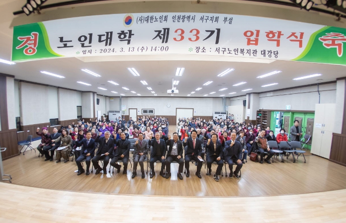 [뉴스서치] 인천시 서구는 13일 대한노인회 서구노인지회 부설 노인대학 제33기 입학생 144명의 어르신이 참여한 가운데 입학식을 개최했다고 밝혔다.