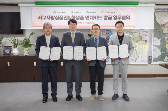 [뉴스서치] 인천 서구는 18일 가정고등학교, 대인고등학교, ㈜코나아이와 ‘서구사랑상품권(서로e음)과 학생증이 결합된 특화카드 발급’을 위한 업무협약을 체결했다고 밝혔다.