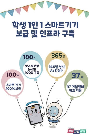 학생 1인 1스마트 기기 보급 100% 완료(114만5,035대), 무선 인프라 100% 구축, 학교 스마트기기 통합 유지 관리 서비스를 운영하고 인공지능 기반 교수·학습 플랫폼 ‘하이러닝’을 구축해 교사의 수업 설계, 학생의 학습진단을 고도화해 책임교육을 실현했다.