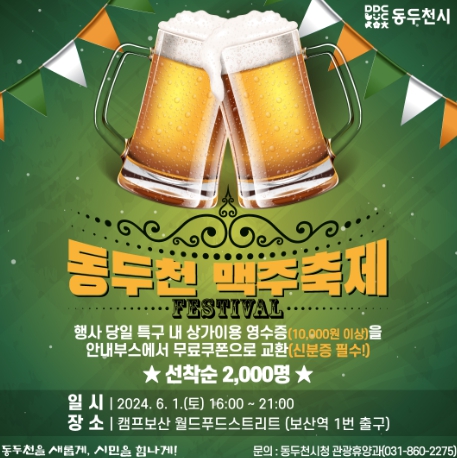 [뉴스서치] 동두천시는 오는 6월 1일 보산동 월드푸드 거리 일원에서 ‘2024 동두천 맥주 축제’를 개최한다. 이번 축제는 동두천시와 보산동 상가연합회가 협력해 지역 상권 활성화를 목적으로 이뤄진다.