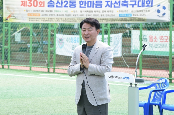 ▲ 김동근 시장이 5월 12일 ‘제30회 송산2동 한마음 자선축구대회’에 참석해 축사를 하고 있다. |