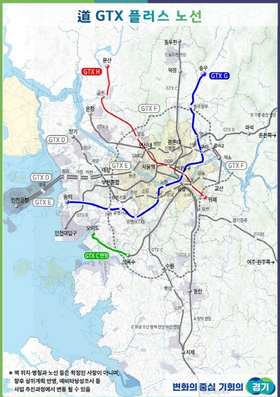 한편, GTX플러스 노선은 총 3개의 신설 또는 연장 노선으로 ▲인천을 시작으로 광명‧시흥 신도시와 KTX광명역을 거쳐 강남, 포천까지 84.7km를 신설하는 G노선 ▲파주와 위례신도시 잇는 60.4km의 H노선 ▲GTX C노선 종점인 상록수에서 시흥 오이도까지 14.2km 연장하는 노선이 있다.