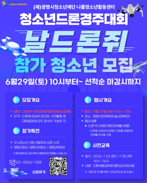 [뉴스서치] (재)광명시청소년재단 나름청소년활동센터는 2024년 청소년드론경주대회 [날드론쥐] 참가 청소년을 6월 29일 10시부터 광명시 2009년생 ~ 2012년생(초등6학년~중등3학년에 해당) 청소년을 대상으로 모집을 시작한다.
