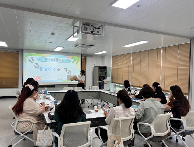 『물 절약』테마는 책 읽기 나눔 활동과 함께 양말목 활용 물방울 키링 만들기, 물 자원 아껴 쓰기 관련 뱃지 만들기로 연수가 진행됐다.