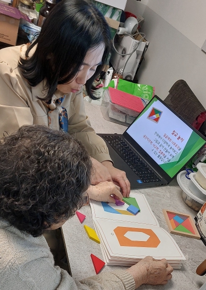 치매환자의 집에 전문가가 직접 방문해 학습을 놀이처럼 재미있게 구성하여 치매 노인의 수업 집중도를 높이는 것이 특징이다.