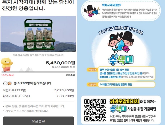 [뉴스서치] 의정부시는 복지 사각지대 발굴 ‘수(水)색대’ 사업을 위해 개설한 ‘카카오같이가치’ 의 모금을 100% 달성했다고 18일 밝혔다.