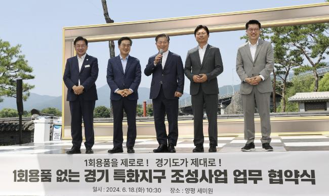 ▲ 지난 6월 양평에서 열린 '1회용품 없는 경기 특화지구 조성사업 업무 협약식'에 박승원 광명시장이 참석했다. 광명시는 무의공 음식문화거리와 광명사거리 먹자골목 두 곳이 특화지구로 지정됐다. 사진 왼쪽 세 번째 박승원 광명시장. |