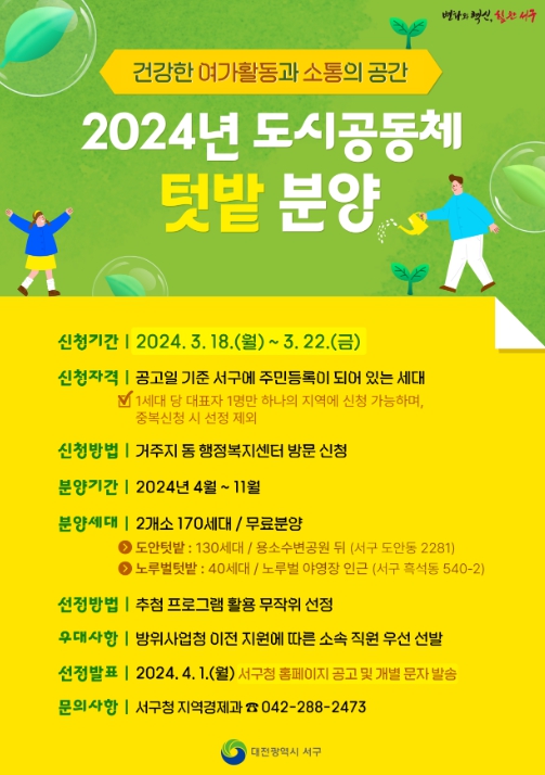 도시농업에 관심이 있고 가족과 함께할 수 있는 여가생활 공간을 원하는 서구민 누구나 신청할 수 있으며, 1세대 당 대표자 1명이 하나의 지역에만 분양 신청할 수 있다.