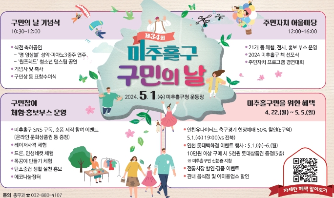 [뉴스서치] 인천 미추홀구는 오는 5월 1일 ‘제34회 구민의 날’을 맞이해 기념행사와 함께 구민을 위한 특별한 혜택을 준비했다.