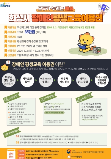 이번 공모선정에 따라 화성시 내 19세 이상 등록 장애인 40명은 1인당 연간 35만원(우수 이용자 최대 70만원)의 평생교육이용권을 받아 등록된 평생교육기관의 프로그램을 수강할 수 있게 됐다.