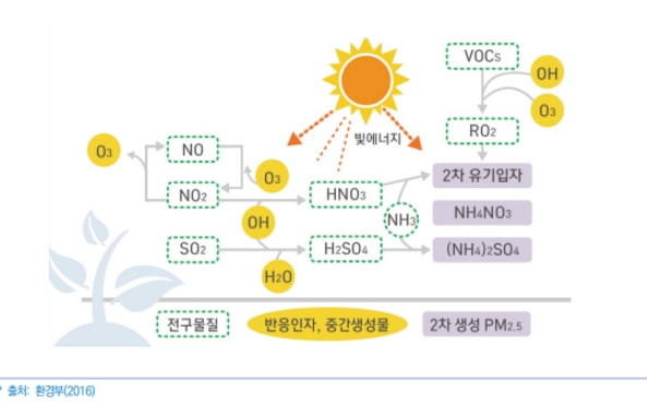미세먼지는 자동차 매연, 소각시설에서 발생하는 연기 등 ‘1차 미세먼지’와 가스상 오염물질이 공기 중의 다른 물질과 물리화학 반응을 일으켜 발생하는 ‘2차 미세먼지’로 나누어진다.