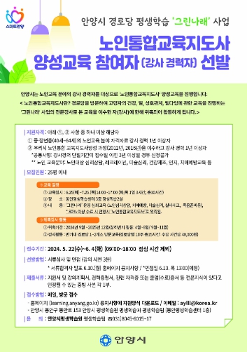 [뉴스서치] 안양시는 경로당 평생학습 ‘그린나래’ 사업의 전담 강사인 ‘노인통합교육지도사’ 양성과정 참여자를 모집한다고 21일 밝혔다.