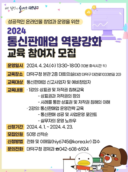 교육은 4월 24일 대덕구청 대회의실에서 진행되며, 참여를 희망하는 업체는 오는 23일까지 대덕구 경제과로 신청하면 된다.