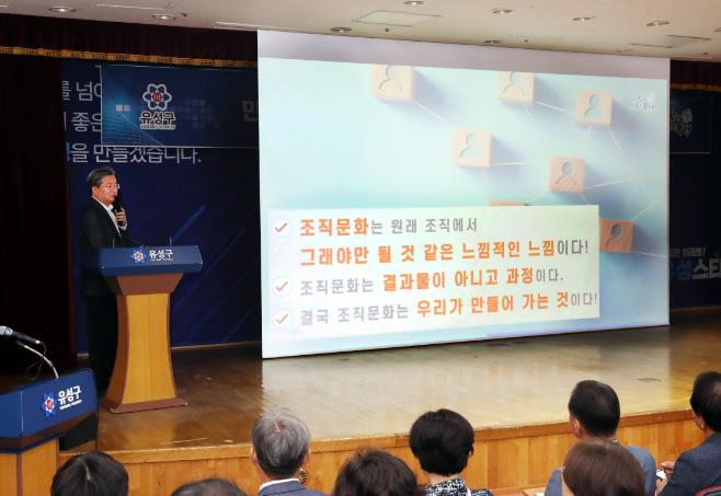 이번 특강은 지난 2년의 성과를 돌아보고 남은 2년의 구정 핵심가치를 직원들과 공유하기 위한 소통의 자리로 마련됐으며, 혁신의 재정립을 통해 더 크게 성장하는 유성구의 혁신 RE:MAKE 미래비전을 제시했다.
