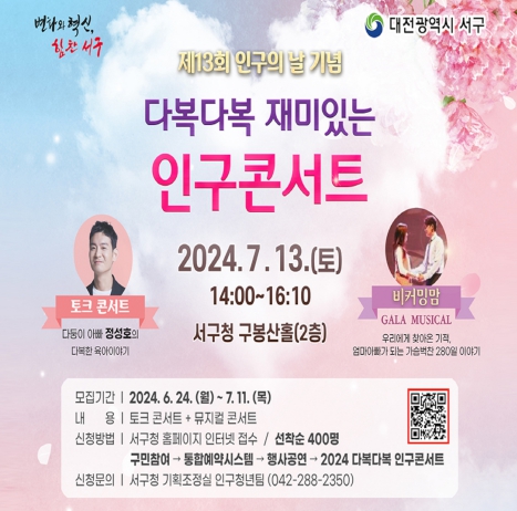[뉴스서치] 대전 서구가 오는 13일 구청 2층 구봉산홀에서 '다복다복 재미있는 인구콘서트'를 개최한다고 3일 밝혔다.
