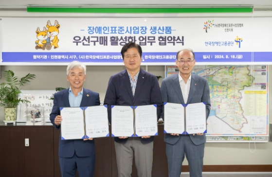[뉴스서치] 인천 서구는 지난 16일 인천시 기초자치단체 중 최초로 (사)한국장애인표준사업장협회 인천지회(회장 김영훈), 한국장애인고용공단 인천지사와 장애인표준사업장생산품 우선구매 활성화를 위한 업무 협약을 체결했다.