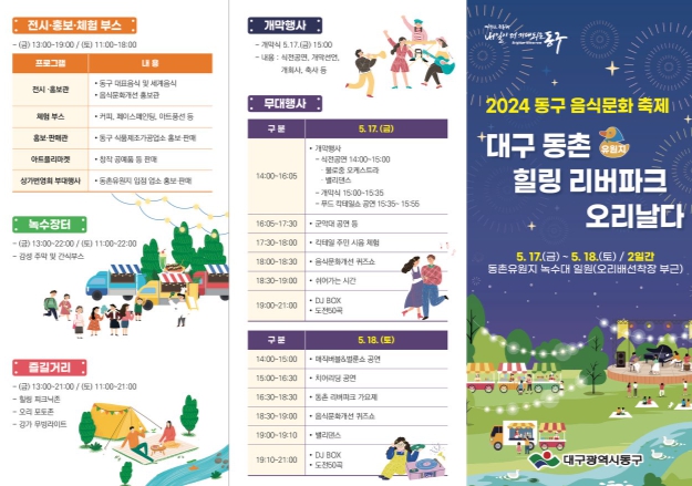 [뉴스서치] 대구 동구청은 오는 17 부터 18일 양일간 동촌유원지 녹수대 일원에서 ‘2024 동구 음식문화축제’를 개최한다.