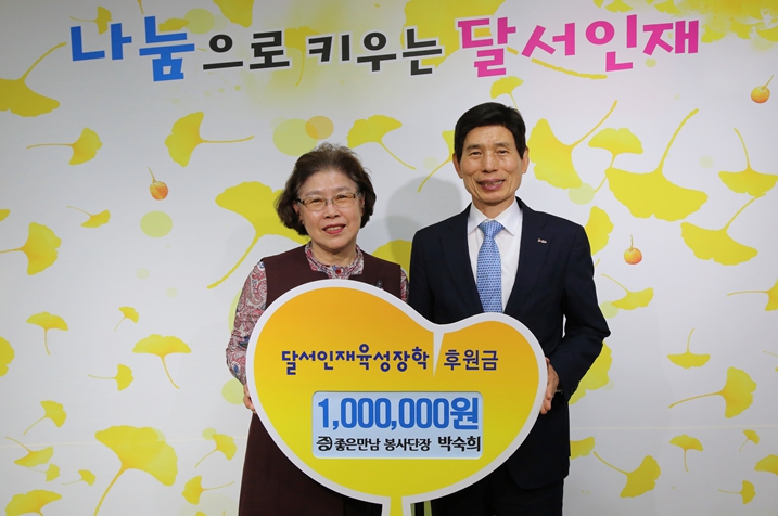 [뉴스서치] 대구 달서구가 27일 박숙희 좋은만남 봉사단장이 지역인재 육성을 위해 써달라며 100만원의 후원금을 달서인재육성장학재단에 전달했다고 밝혔다.